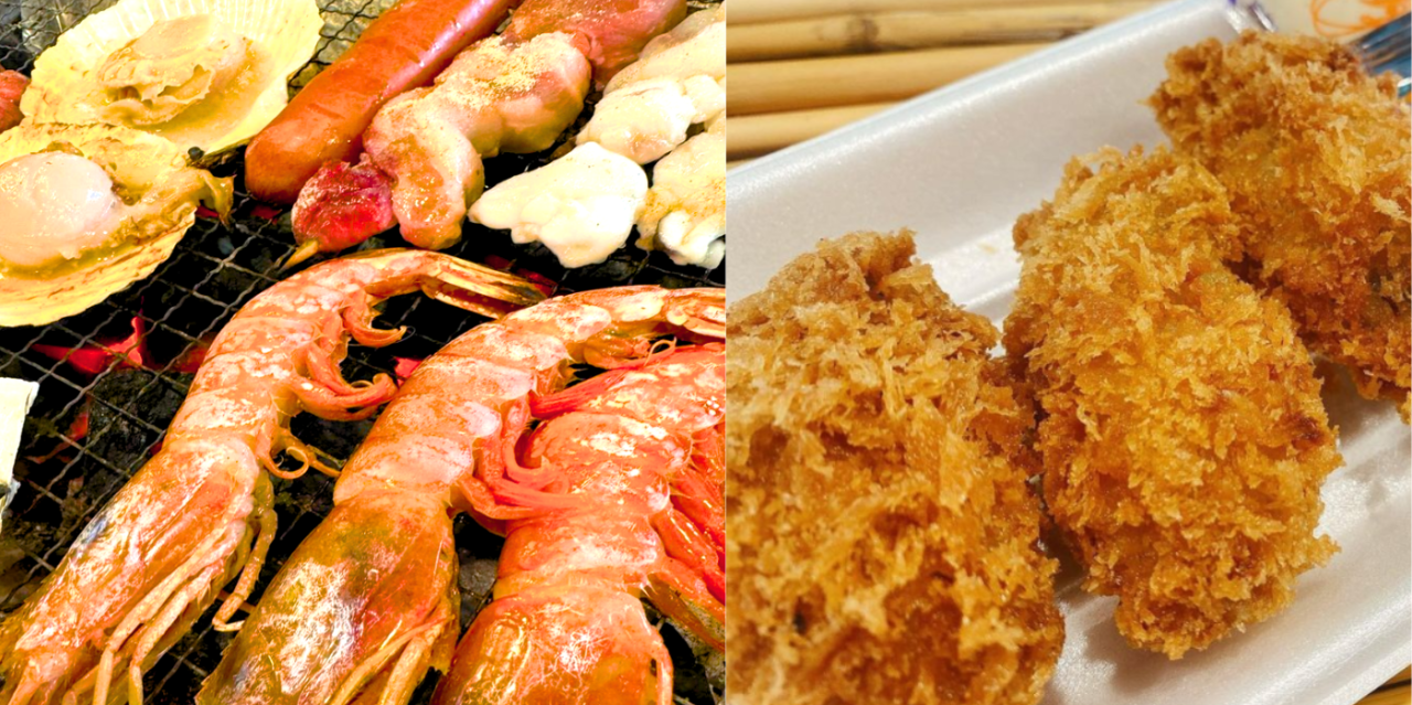 新鮮なサザエ、ホタテ、アワビ、ホッキ貝、ホンビノス貝、エビ、タコ串、イカ串などの浜焼きや、牡蠣フライ、牡蠣ごはん、牡蠣汁、牛串、豚串、フランクフルト、フライドポテト、コーンバター、その他おつまみ、ソフトドリンク、アルコールも多数用意。さらに日替わり食材や、数量限定で様々な産地の牡蠣が登場する場合も!!